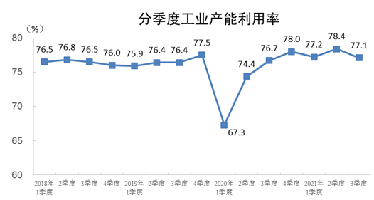 国家统计局:2021年第三季度中国全国工业产能利用率为77.1%,比上年同期上升0.4个百分点。