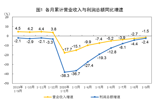 国家统计局:2020年1—9月中国全国规模以上工业企业实现利润总额43665.0亿元,同比下降2.4%(按可比口径计算,详见附注二),降幅比1—8月份收窄2.0个百分点。