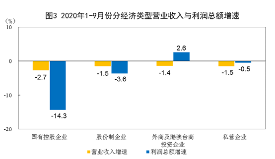 1—9月份,规模以上工业企业中,国有控股企业实现利润总额11303.1亿元,同比下降14.3%;股份制企业实现利润总额30681.1亿元,下降3.6%;外商及港澳台商投资企业实现利润总额12443.0亿元,增长2.6%;私营企业实现利润总额12748.3亿元,下降0.5%。