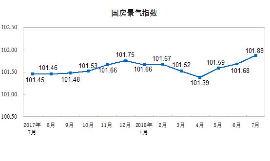 7月份,房地产开发景气指数(简称“国房景气指数”)为101.88,比6月份提高0.20点。