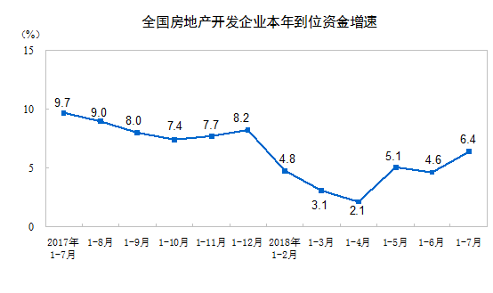 1-7月份,房地产开发企业到位资金93308亿元,同比增长6.4%,增速比1-6月份提高1.8个百分点。其中,国内贷款14045亿元,下降6.9%;利用外资33亿元,下降70.1%;自筹资金30187亿元,增长10.4%;定金及预收款31013亿元,增长15.1%;个人按揭贷款13655亿元,下降1.4%。