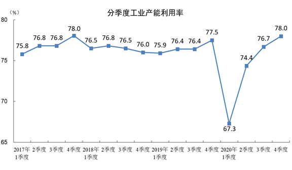 国家统计局: 2020年第四季度中国全国工业产能利用率为78.0%,比上年同期上升0.5个百分点,比三季度上升1.3个百分点。2020年全国工业产能利用率为74.5%,比上年下降2.1个百分点。