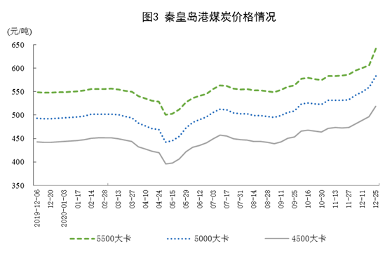 港口煤炭综合交易价格上涨。12月25日,秦皇岛港5500大卡、5000大卡和4500大卡动力煤综合交易价格分别为每吨642元、583元和519元,比11月27日分别上涨56元、50元和45元。