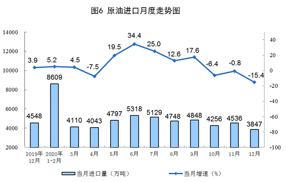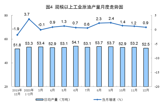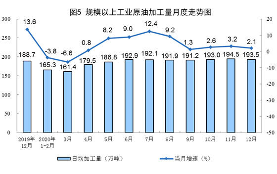 原油生产增速略有放缓。12月份,生产原油1627万吨,同比增长0.9%,增速比上月回落0.3个百分点;日产52.5万吨,环比减少0.7万吨。加工原油6000万吨,同比增长2.1%,比上月回落1.1个百分点。2020年,生产原油1.95亿吨,比上年增长1.6%;加工原油6.7亿吨,增长3.0%。