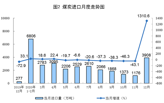 煤炭进口增加。12月份,进口煤炭3908万吨,环比增加2732万吨。2020年,进口煤炭3.04亿吨,比上年增长1.5%。