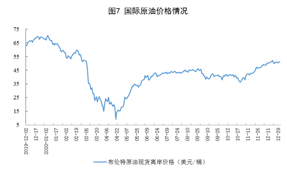 原油进口降幅扩大,国际原油价格继续上涨。进口原油3847万吨,环比减少689万吨,同比下降15.4%,降幅比上月扩大14.6个百分点;2020年,进口原油5.4亿吨,比上年增长7.3%。12月31日,布伦特原油现货离岸价格为51.22美元/桶,比11月30日的46.84美元/桶上涨9.4%。