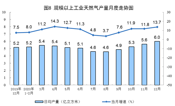天然气生产持续快速增长。12月份,生产天然气187亿立方米,同比增长13.7%,增速比上月加快1.9个百分点;日产6.0亿立方米,环比增加0.4亿立方米。2020年,生产天然气1888亿立方米,比上年增长9.8%,连续四年增产超过100亿立方米。