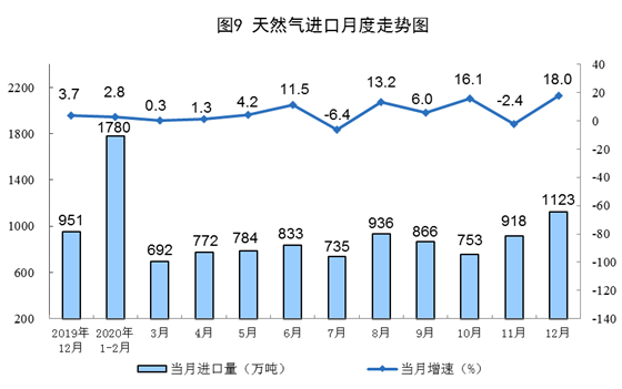 天然气进口由降转增。12月份,进口天然气1123万吨,同比增长18.0%,上月为下降2.4%。2020年,进口天然气1.02亿吨,比上年增长5.3%。