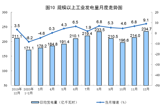 电力生产增速继续加快。12月份,发电量7277亿千瓦时,同比增长9.1%,增速比上月加快2.3个百分点;日均发电234.7亿千瓦时,环比增加20.7亿千瓦时。2020年,发电量74170亿千瓦时,比上年增长2.7%。
