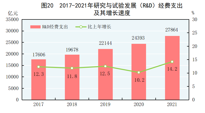 全年研究与试验发展(R&D)经费支出27864亿元,比上年增长14.2%,与国内生产总值之比为2.44%,其中基础研究经费1696亿元。国家自然科学基金共资助4.87万个项目。截至年末,正在运行的国家重点实验室533个,纳入新序列管理的国家工程研究中心191个,国家企业技术中心1636家,大众创业万众创新示范基地212家。国家科技成果转化引导基金累计设立36支子基金,资金总规模624亿元。国家级科技企业孵化器