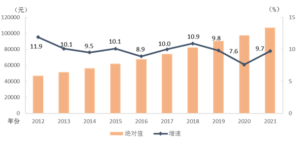 2012-2021年城镇非私营单位就业人员年平均工资及增速