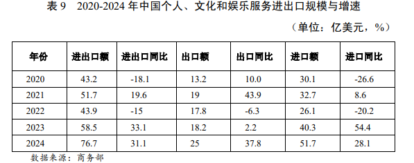 2020年~2024年中国文化娱乐服务出口、进口总额