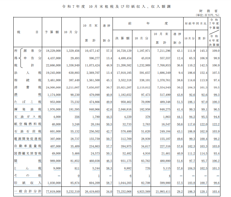 2025年10月日本中央政府财政收入