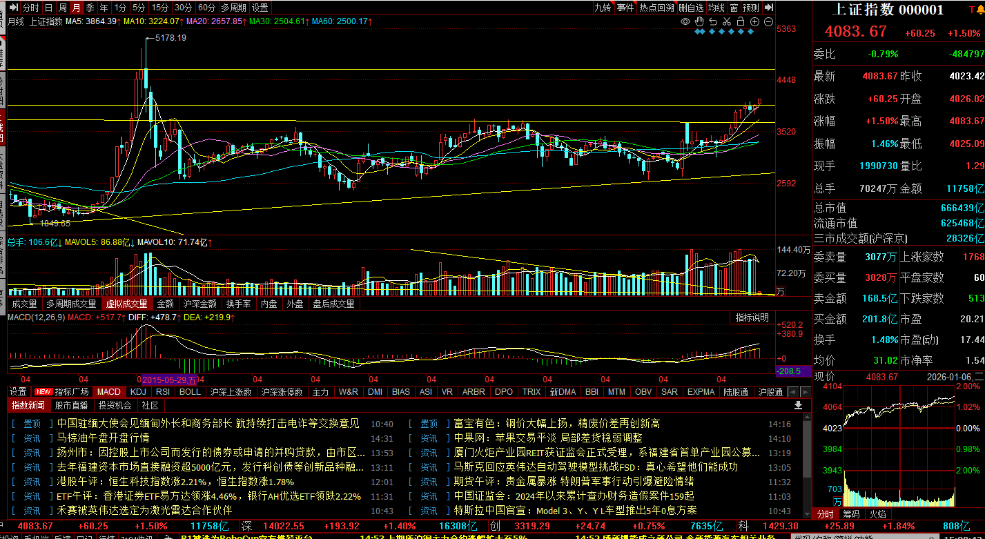 2026年1月6日,上证综指收于 4083.67,环比上涨60.25点,涨幅1.50%。日K线图、周K线图、月K线图均突破了2015年高点5178点以来的压力线。上证综指进入易涨难跌上涨通道。上证综指今年下一个目标就是5178点。